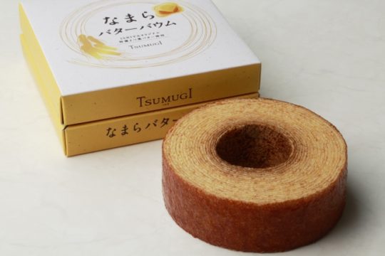 外はさっくり、中はしっとりとしたバウムクーヘン。外側にはアイシング(砂糖衣がけ)をし、さっくりと、甘い仕上げが更なるバター感を醸成。パッケージにはTSUMUGIシリーズのシンボルである「麦穂」をデザインしている。特選よつ葉バターと道産小麦を使ったバウムクーヘンは、北海道のおいしさがぎゅっと詰まった、とても北海道らしいバウムのため「なまらバターバウム」と名付けた。