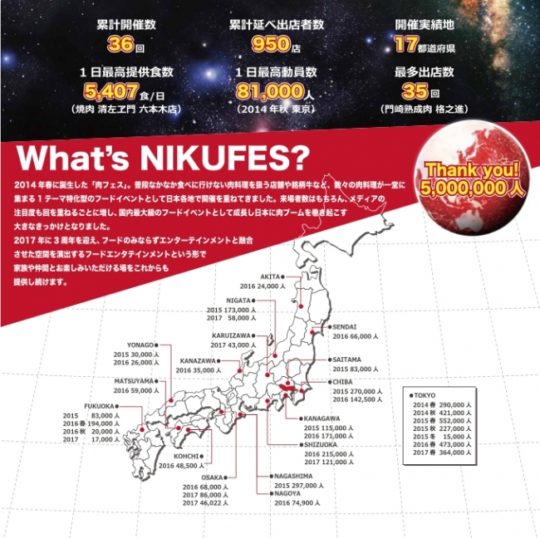 2014年春に誕生した肉フェスは、累計開催数36回目(日本17都道府県)と開催を重ね、2017年9月14日より東京と大阪にて2会場同時開催中の「肉フェス TOKYO 2017 秋」「肉フェス OSAKA 2017」にて、2017年9月16日に累計来場者数が500万人を突破。