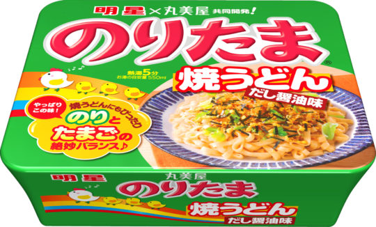 「明星 のりたま 焼うどん だし醤油味」は、ふりかけ「のりたま」を使用した丸美屋食品工業株式会社との共同開発商品。2017年5月に発売して、大好評のうちに予定数量を完売したが、お客からの要望に応えるべくして、この度再発売する。