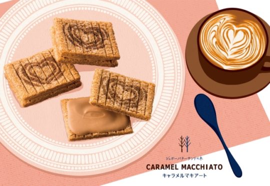 『シュガーバターサンドの木 キャラメルマキアート』は、1個まるごとがキャラメルマキアート・ワールド。中は、芳醇な香りと濃厚なコクにこだわったキャラメルマキアートショコラ。“コーヒー本来の味と香りを活かしたエチオピア産モカ” と“国産ミルクを丁寧に煮詰めたキャラメル” の独自ブレンドで仕立てた。外もキャラメルマキアート・スタイルで、華やかな“ラテアート・ハート” を描き上げた特別仕様のシュガーバターシリアル生地になっている。さらにパッケージにも、お菓子とおそろいの“ラテアート・ハート” をデザイン。