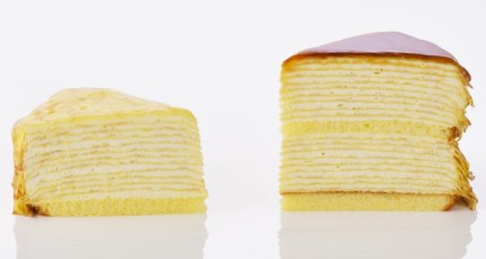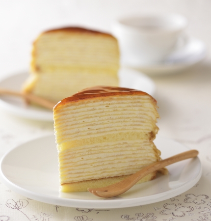 ・特長 :クレープの皮19枚を重ねた高さ約90mmのジャンボなミルクレープ。間にサンドしたクリームとの調和が楽しめる。