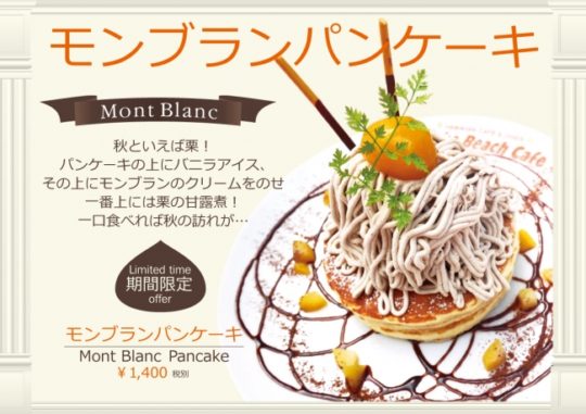 江ノ島のハワイアンカフェ「アロハビーチカフェ」より、秋の味覚「モンブランパンケーキ」を期間限定で発売開始する。