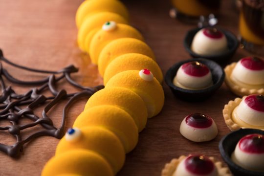 爽やかなラズベリーの酸味が広がるバタークリームを挟んだ「ドラキュラマカロン」は、食べるのが可哀そうになるほどキュート。鮮やかな赤が目を引く「血塗りのショートケーキ」は、ザクロのグラサージュの上に目玉をアクセントにトッピング。そして、ホワイトチョコレートケーキで作り上げた「イモ虫のタルト」は、本物さながらのクオリティー。