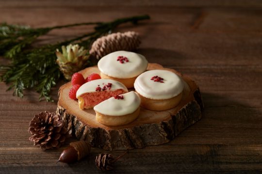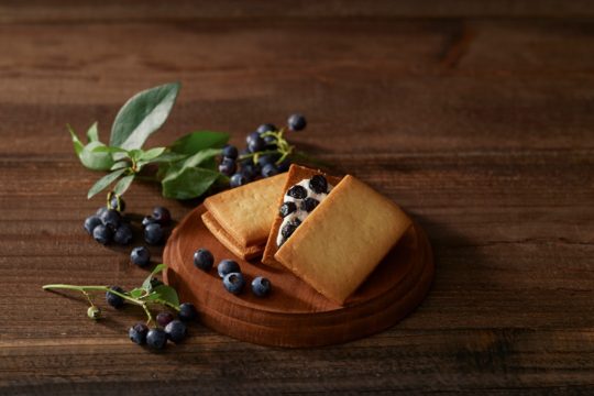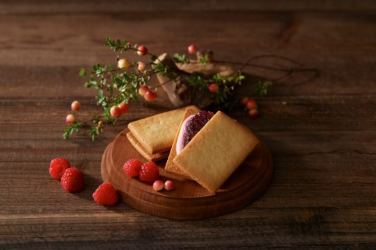 ・商品特徴:練乳を練りこみサクっとした食感に焼き上げたサブレで、ベリーの果肉入りクリームをサンド。
