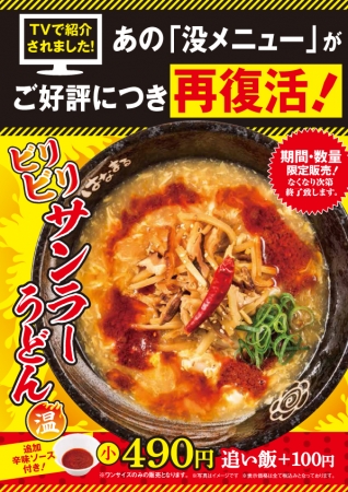 讃岐うどんチェーン「はなまるうどん」を展開する株式会社はなまるは、2017年10月10日(火)よりテレビ番組のコーナーで復活販売をしたメニュー『ビリビリサンラーうどん』を全国のはなまるうどん(一部店舗除く)にて期間限定で再販売する。