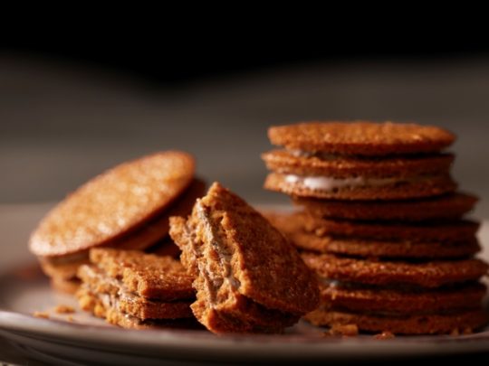 キャラメル味のクッキーと紅茶の茶葉入りのキャラメルチョコレートを5層で仕立てた、サクサク感が特徴のクッキー。