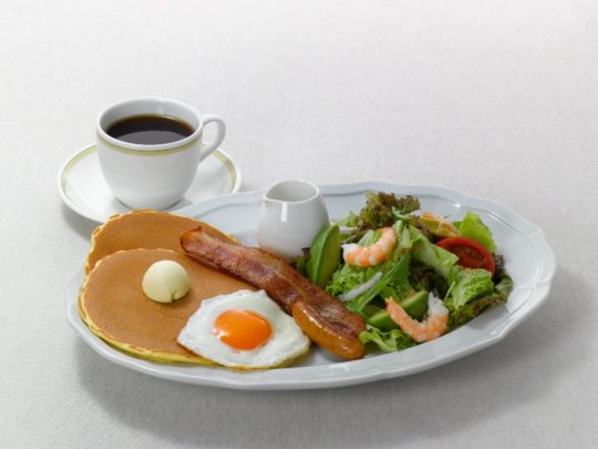 ロイヤルホストの伝統メニューのひとつである「パンケーキ」2枚とアボカドとシュリンプの入った「サラダ」や「フライエッグ」「ベーコン」「ソーセージ」 をワンプレートで。