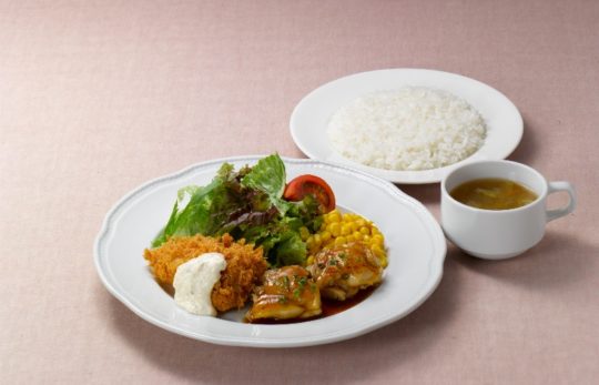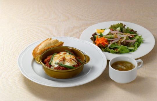 イタリアの鶏肉の煮込み料理「カチ ャトラ」をロイヤルホスト風にアレンジ。鶏肉にトマトソースをかけ、いんげんとチーズをトッピングして香ばしく焼き上げた。