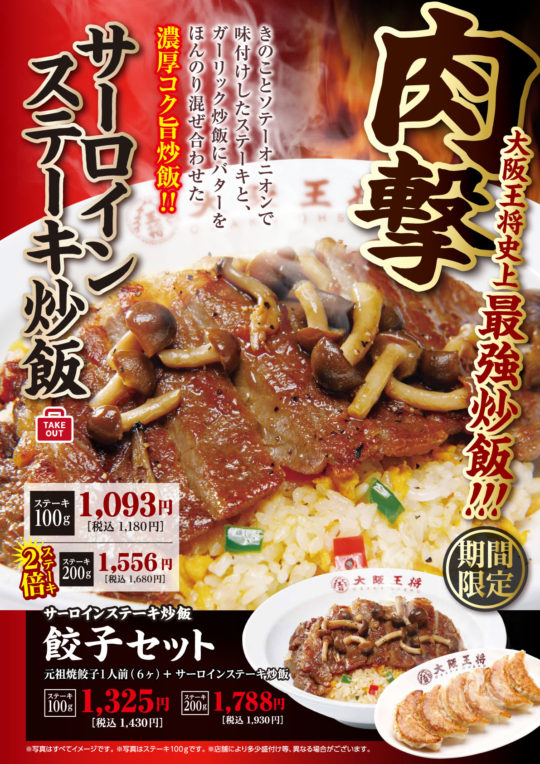 餃子専門店「大阪王将」は、昨年好評だった“肉撃”をコンセプトにした高付加価値商品「サーロインステーキ炒飯」を今年も期間限定で販売する。