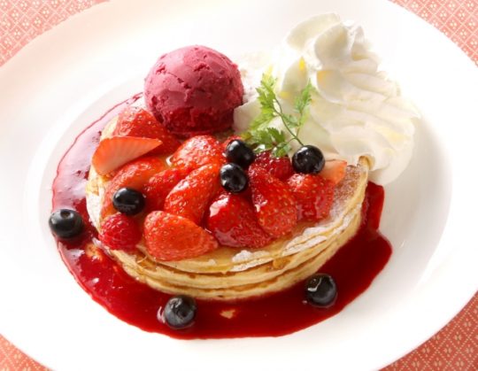 今回販売する「ミックスベリーパンケーキ」は、ほんのり甘いふわふわのパンケーキに、ラズベリー、ブルーベリー、ストロベリーの3種のベリーとフランボワーズソルベ、ホイップクリームをのせた彩り鮮やかなパンケーキ。