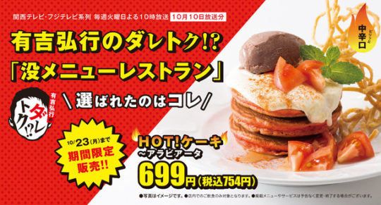 デニーズは、「有吉弘行のダレトク!?」(関西テレビ・フジテレビ系列、毎週火曜よる10時放送)の「没メニューレストラン」で選ばれた、ワケあって販売にいたらなかった幻の没メニュー1品を2017年10月11日(水)~2017年10月23日(月)の期間限定で販売する。