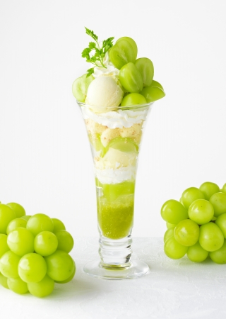 特 長:白ぶどうの新品種シャインマスカットを贅沢に使用したパフェ。皮ごと食べられる種なしぶどうで、酸味や渋味も少なく、皮のパキッとした食感とともに、ゆかたな甘みと高貴な香りが特徴。