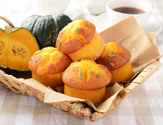 えびすかぼちゃのペーストを練りこんだマフィン。生地に水あめを使用することでしっとりした食感に仕上げた。食感と風味のよいパンプキンシードをトッピング。