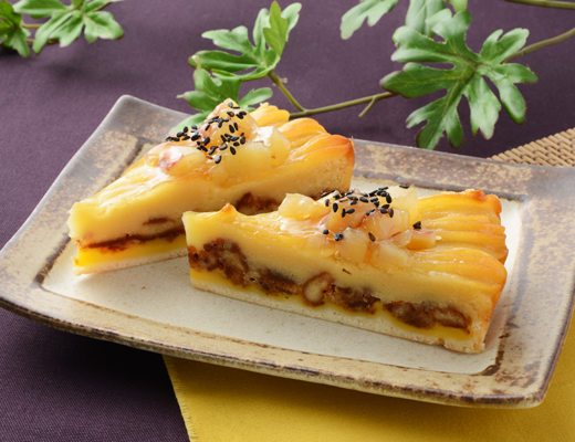 クリーミーなかぼちゃサラダの層と、ほくほく食感のかぼちゃとチーズの風味が楽しめる層の2層仕立て。食感のアクセントにナッツを使用。
