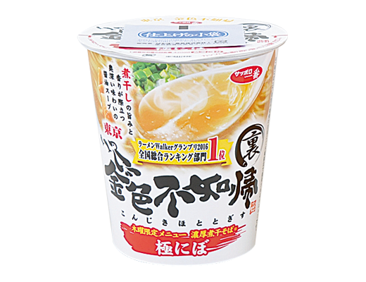 ラーメンWalkerグランプリ2016全国総合ランキング部門1位の名店「金色不如帰」の木曜日限定メニュー、極にぼの味わいを再現した。煮干しの奥深いうまみが感じられる濃厚醤油味に仕上げた。