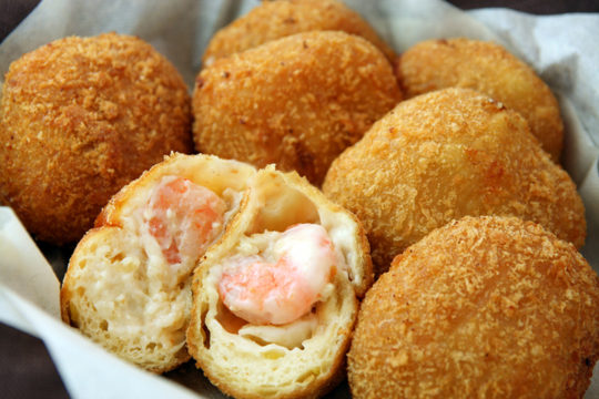 「ホワイトカレーパン」は、フュメ・ド・ポワソン(魚介出汁)がベースの白いカレーソースは、クリーミーでコクのある美味しさと青唐辛子のクリアな辛さが特徴。海老と一緒に生地に包み、カラッと揚げてカレーパンに仕上げた。