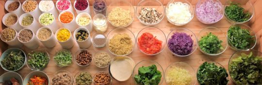 おすすめはカスタムサラダ。30種類前後の食材を同一料金で何種類でも選択できる。10種類以上ある自家製ドレッシングを複数選択し、自分だけのオリジナルサラダを朝から晩までいつでも食べることができる。