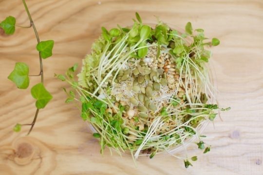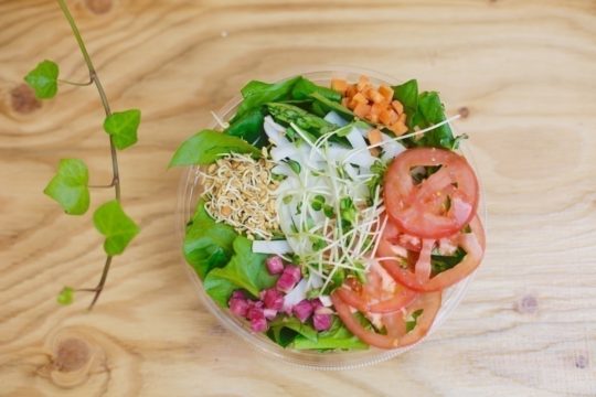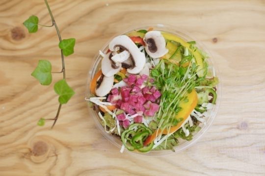 サラダビュッフェ&デリでは有機野菜だけでなく、グリーンハウスで栽培している無農薬のスプラウト(発芽野菜)や、クレンズスープ、そしてローフード以外にも素材にこだわった玄米、トルティーヤやバゲットの提供も行う。