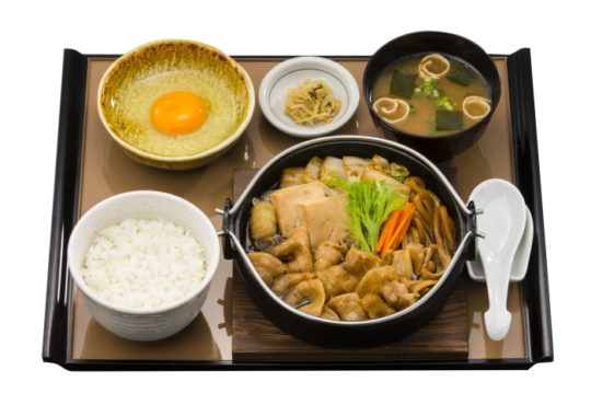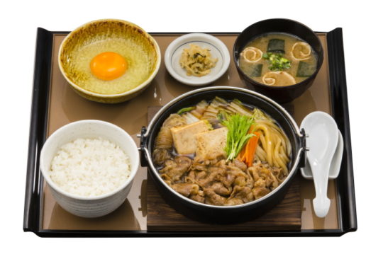 「やよい軒」のすき焼きは肉と白菜、水菜、人参、しらたき、豆腐、うどんの具材をたっぷりのタレで煮込む。