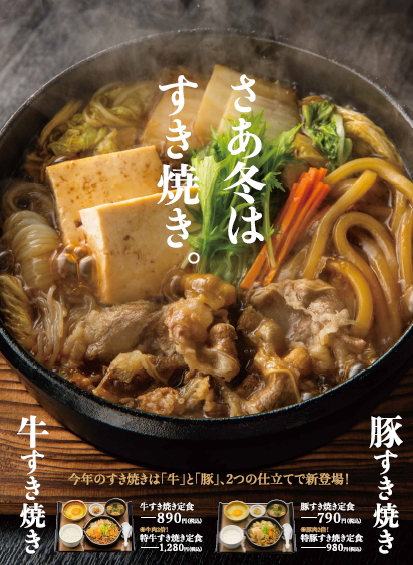 今年は牛肉と豚肉の2種類のすき焼きを展開。肉の量が2倍の『特牛すき焼き定食』1,280円(税込)、『特豚すき焼き定食』980円(税込)も同時発売する。