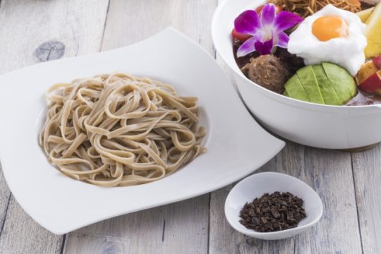 カカオの風味を増やしたい時は「追いチョコ」(右下)をオーダーしてください。〆はヘルシーな蕎麦パスタで。