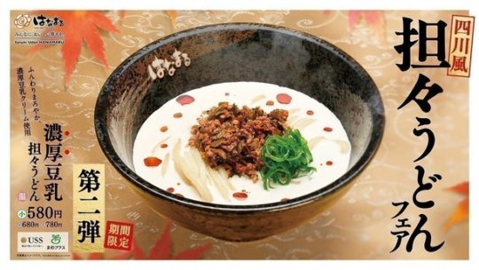 讃岐うどんチェーン「はなまるうどん」を運営する株式会社はなまるは、全国の「はなまるうどん」店舗にて「四川風担々うどんフェア」の期間限定メニュー第二弾「濃厚豆乳担々うどん」を11月1日(水)に販売を開始する。