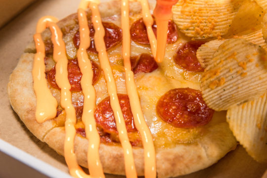 今回のコラボメニューでは、「ピザポテト」や「ピザポテト 濃厚チーズ味」の味わいを再現したピザと横に添えた「ピザポテト」のチップスに、さらにチーズをかける“追いチーズ”をしたもので、“夢のピザポ体験”が楽しめる。
