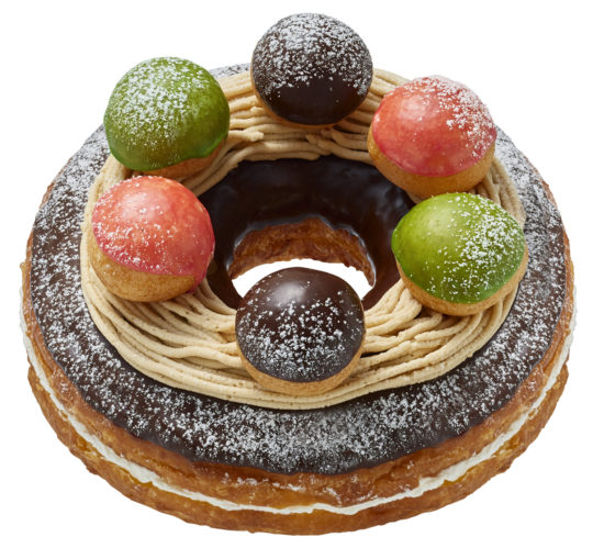 マロンホイップを絞り、色鮮やかなポン・デ・リング生地のドーナツポップをトッピング。