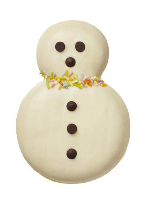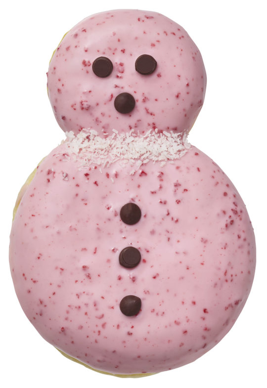 雪だるまをモチーフにしたイースト生地にストロベリーホイップとホイップクリームを詰め、ストロベリーチョコでコーティングし、チョコチップとココナツで雪だるまのように仕上げた。