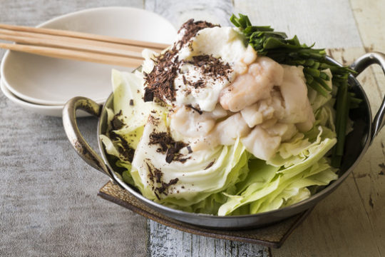 内容 :当店自慢のだしの効いたスープをベースにしたもつ鍋に、自家製のチーズ豆腐をトッピング。苦味が特徴的な高カカオのチョコレートを最後に豪快に振りかける。チーズ豆腐とチョコレートが溶けていくことで、クリーミーかつコクのあるスープに。寒い冬にぴったりのメニュー。