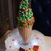 チョコレートシェイクをベースに、生クリームやクッキー、さらにチョコレート菓子を 合わせた期間限定デザート。高さ30cmを超えるクリスマスツリーのようなインパクト大のシェイク。
