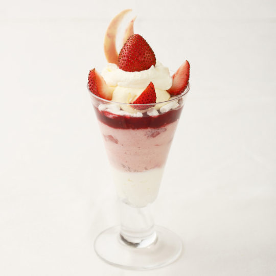 ●商品説明:贅沢にいちごを使い、いちごムース、ヨーグルトやサクサク食感が楽しいメレンゲといちごピンクのグラデーションが可愛らしいパフェ。
