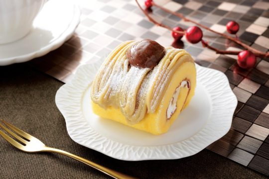 和栗のクリームを贅沢に使ったモンブランノエル。スポンジに和栗のムースとクリームを巻き、ハーフカットした和栗をトッピングした。