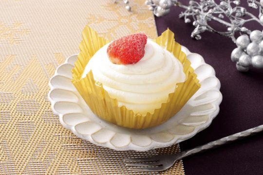 毎年人気のスノーボンブ。スポンジにバニラビーンズ入りのカスタードクリームとホイップクリームを合わせ、苺をトッピング。