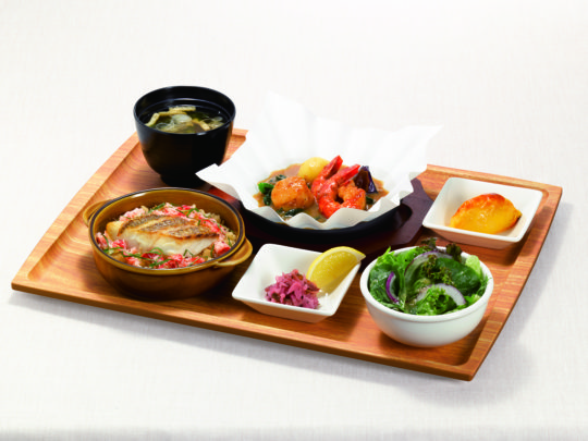 ゆずぽん酢と生姜が香る「和風ピラフ」に、紅ずわい蟹のほぐし身や大葉をトッピング。ほどよく脂がのった天然真鯛をのせた豪華な一品。北海道オホーツク産の帆立を使用した人気メニュー「海老と帆立のあつあつグリル(小)」と一緒に楽しめる。デザートにはロイヤル伝統のスイートポテト(ミニサイズ)を。