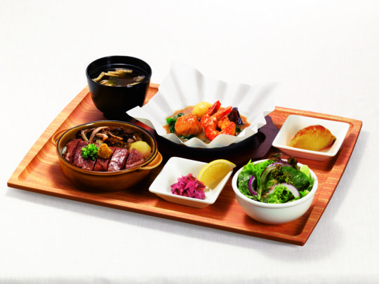 やわらかな食感と甘みのある黒毛和牛を使ったステーキご飯。しっとり焼き上げた和牛ステーキに醤油を薄くまとわせた。バターが香る醤油ベースのソースで仕上げた「海老と帆立のあつあつグリル(小)」も一緒に楽しめる。デザートにはロイヤル伝統のスイートポテト(ミニサイズ)を。