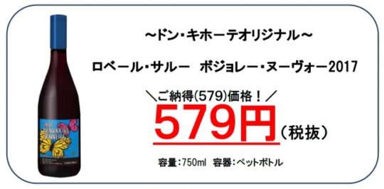 ドン・キホーテグループは、2010年より日本国内で販売されるボジョレー・ヌーヴォーの最安値に挑戦し、7年連続国内市場最安値を実現している。今年もフランスへ足を運び、現地で直接買い付けを行うことで輸送のコスト等を最低限に抑え、2017年も税抜き価格「579円」という圧倒的低価格を実現した。