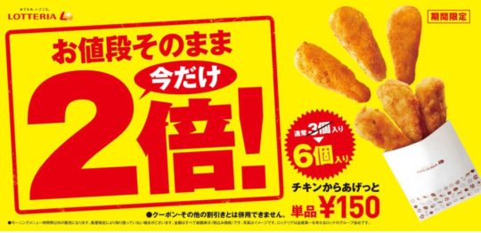 株式会社ロッテリアは、2017年11月16日(木)~23日(木)までの8日間限定で、「お値段そのまま今だけ2倍!チキンからあげっと」キャンペーンを全国のロッテリアにて実施する。