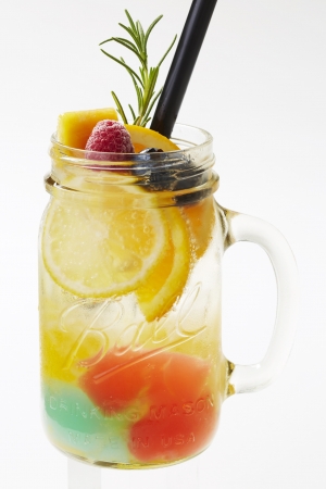 スパークリングレモネードにカラフルな3色のゼリーとフルーツをトッピング。