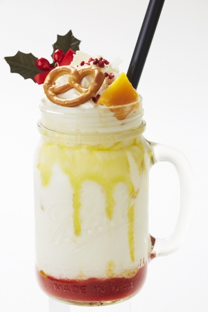 ふわふわホイップにミニプレッツェルとマンゴーをのせてホワイトチョコレートのスノースタイルに仕上げた。