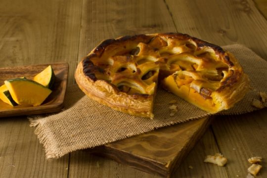 バター、卵、シナモン、生クリームをあわせて炊き上げた滑らかなカボチャクリームと、カボチャの甘露煮をごろごろ乗せて焼き上げた。