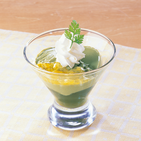 宇治抹茶ゼリーの上に牛乳ではなく、糖質の低い豆乳で作った宇治抹茶プリン、柚子ソースをのせた。宇治抹茶プリンの甘味とほろ苦さ、和のテイストを楽しめる。