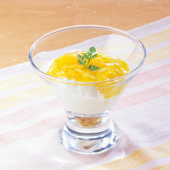 冬に旬を迎える柚子を使用した柚子皮入りの柚子ソースをギリシャヨーグルトにのせた色鮮やかな商品。ザクザク食感のフルーツグラノーラ、すっきりとした味わいのギリシャヨーグルト、さわやかな甘みの柚子ソースを合わせて。