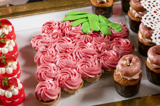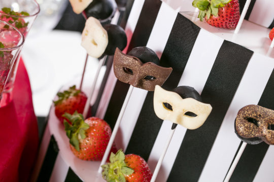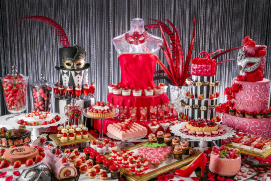 真っ赤なバラをかたどったカップケーキや、マスクを着けたロリポップなど、思わず写真を撮りたくなるような趣向を凝らした逸品ばかり。約30種類の華やかなデザートと、ドレスやマスク、シルクハットなどの装飾が、魅惑的なマスカレードパーティーの世界へと誘う。