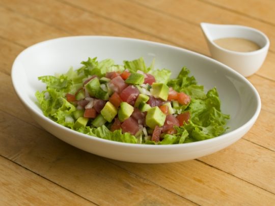 アヒ(マグロ)とアボカド、新鮮な野菜をたっぷり混ぜ込んだサラダボウル。特製ゴマドレッシングを和え、本場ハワイの味を忠実に再現した。