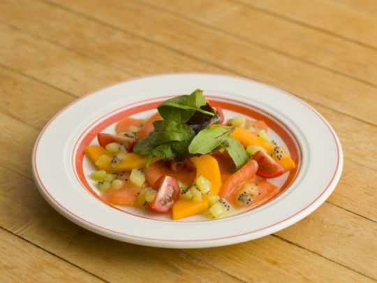 ハワイ産の熟したパパイヤと、脂ののったトラウトサーモンが相性の良いカルパッチョ。甘酸っぱいキウイのビネグレットソースをかけた爽やかな一品。