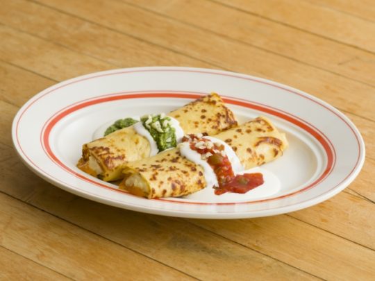 たっぷりのコクのあるチェダーチーズとクリーミーなマッシュポテトを包んだEggs 'n Thingsオリジナルクレープは3種のソース(サルサソース・バジルソース・シルターソース)をたっぷりとつけて召し上がれる。