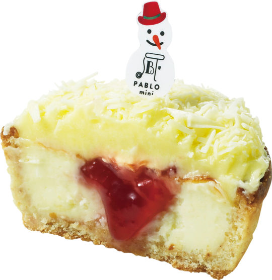12月からはチーズタルトの中心にラズベリーソースを閉じ込めて、ホワイトチョコレートをふりかけた冬色パブロミニが新登場。12/25(月)までクリスマスツリーと雪だるまのスペシャルピックで展開。