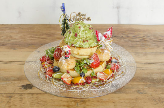 ピスタチオクリームとパンケーキがツリーに変身。フレッシュなフルーツをふんだんにトッピング。