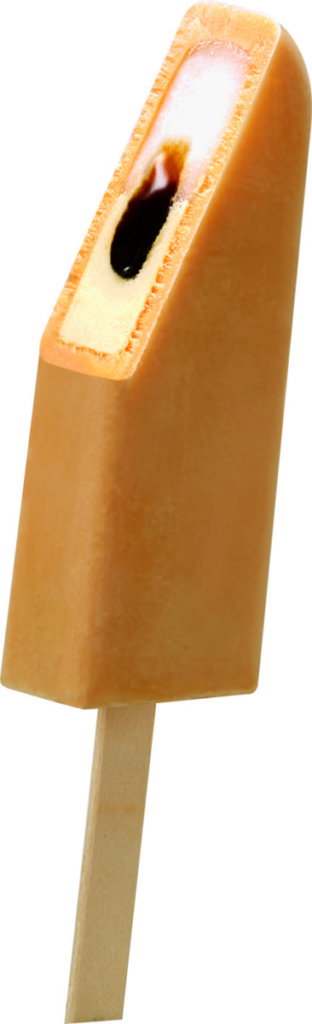 この度の新商品は、きなこ味のアイスキャンディーの中に、もち菓子、黒みつソース、きなこアイスが入ったアイスキャンディー。